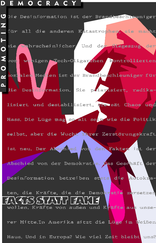 Die Desinformation ist der Brandbeschleuniger für all die anderen Katastrophen, sie macht sie wahrscheinlicher. Und der Siegeszug der von wenigen Tech-Oligarchen kontrollierten sozialen Medien ist der Brandbeschleuniger für die Desinformation. Sie polarisiert, radikalisiert und destabilisiert, sie sät Chaos und Hass. Die Lüge mag so alt sein wie die Politik selbst, aber die Wucht ihrer Zerstörungskraft ist neu. Der Abschied von den Fakten ist der Abschied von der Demokratie. Das Geschäft der Demokratie betreiben stets die Autokraten, die kräfte, die die Demokratie zersetzen wollen. Kräfte von außen und Kräfte aus unserer Mitte. In Amerika sitzt die Lüge im Weißen Haus Und in Europa? Wieviel Zeit bleibt uns?