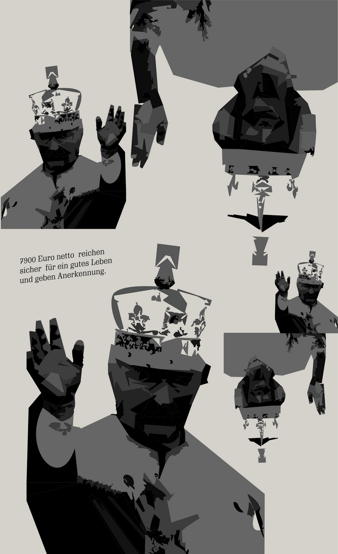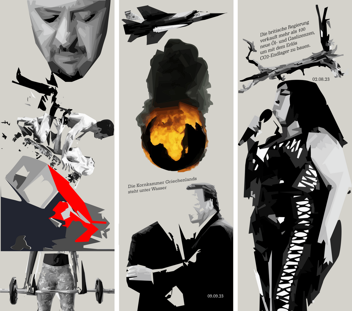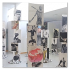 Die Bilder und Headlines dieser Installation entstammen überwiegend den Nachrichten und der Werbung aus dem Netz, ein Mix aus Horrorbildern, belanglosem Tratsch, tröstlichen Werbeversprechen, Texten bekannter Zeitgenossen und eigenen Notizen. Indem ich den virtuellen Online-Botschaften eine physische Existenz gebe, kann ich mich mit der Rolle des Voyeurs konfrontieren, der sein Dasein auf der Zuschauer-Tribüne fristet. Diese Ausstellung ist der verstörende Spiegel einer Zeit, in der exzessives Wissen immer mehr in lähmende Ohnmacht umzuschlagen droht.
