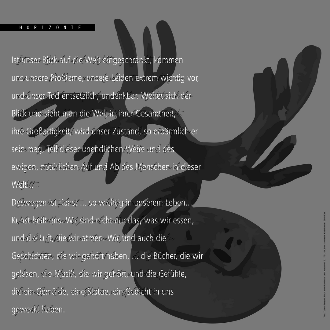 Dieser Zyklus von 27 digitalen Collagen aus literarischen Texten und aktuellen Bildern aus den Online-Medien thematisiert einerseits die Gefährdung unserer Existenz durch die menschliche Hybris, andererseits auch die Vision einer globalisierten Gesellschaft, die den Prinzipien der Humanität, der Fairness und der Demokratie verpflichtet ist.